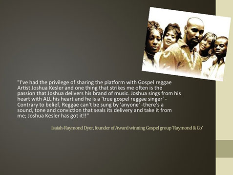 To date Joshua Kesler's gift of singing has taken him to various churches and secular events across the UK as well Barbados, Europe and America. He can be heard belting out gospel reggae with a passion and tenacity that captures his audiences across cultures, age groups and backgrounds.
